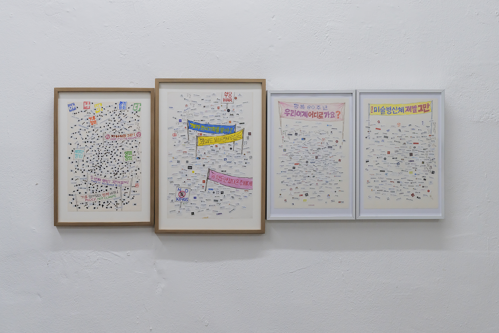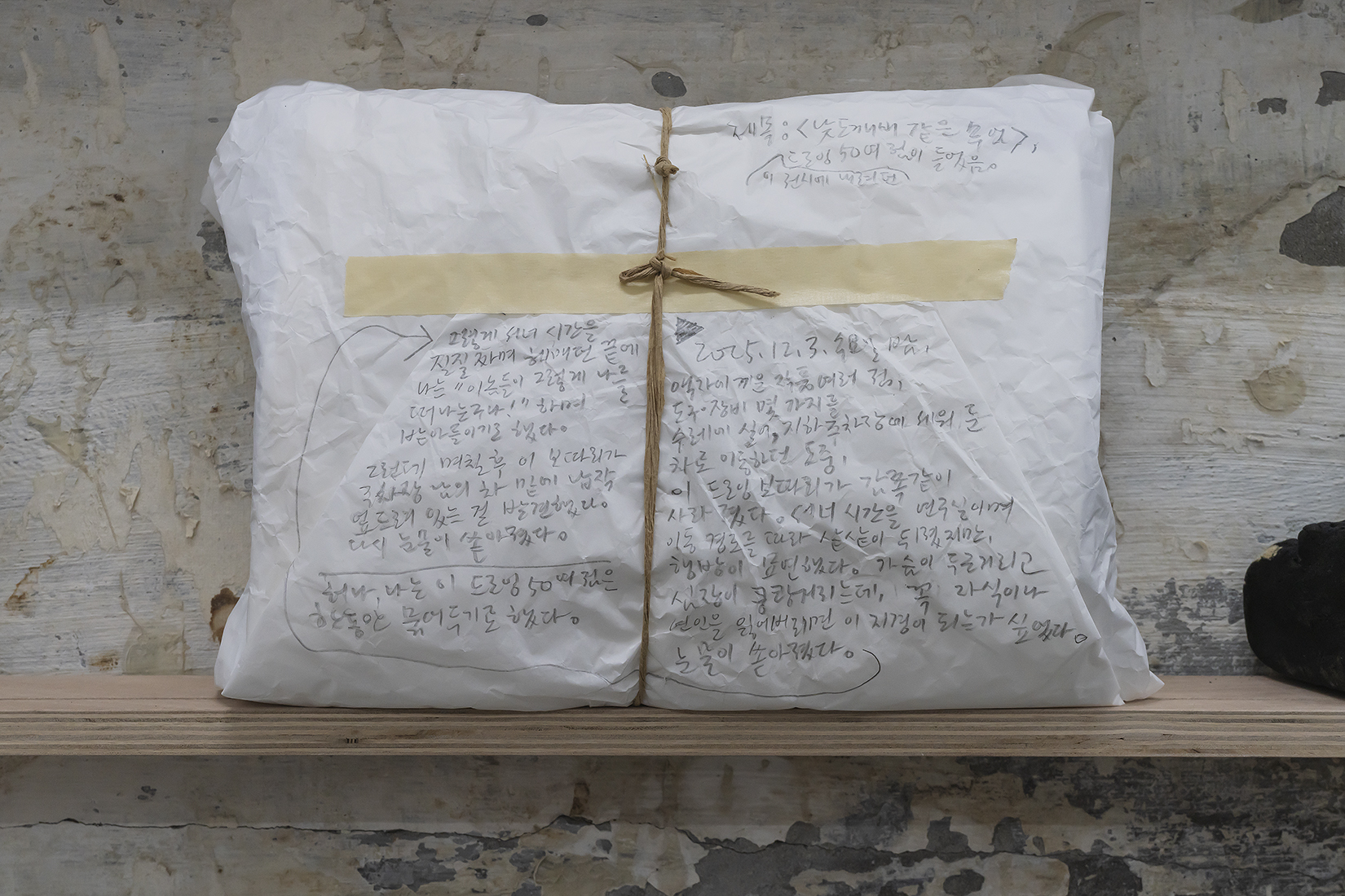 This process gathers several strands: works in which he appropriated the language and grammar of literati painting and calligraphy to critique situations in his own life or broader social conditions within a contemporary context, or to satirize small details spotted on the street from a political angle. It also brings back his meticulous drawings of North Korean submarine interiors and the belongings of armed infiltrators, works through which he once mourned vanished subjects, now re-summoned to resonate with the present atmosphere. Added to this are traces of his attentive efforts to register and engage with the physical conditions of Amado Art Space-its atmosphere, smell, and textures.